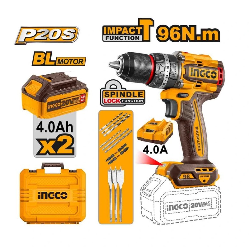 Akumulatorska udarna bušilica SUPER INGCO CIDLI20968E ima maksimalni obrtni momenat do 96 Nm i time pruža snažne performanse. Bušilica se isporučuje sa dve baterije 4.0 Ah i punjačem.