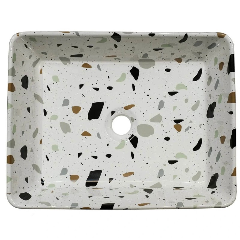 Unesite umetnost u svoje kupatilo uz HidroSan ART-9126, nadgradni umivaonik upečatljivog terrazzo dezena. Sa jasnim geometrijskim oblikom i dekorativnom završnicom, ovaj model se izdvaja kao funkcionalan element koji ujedno predstavlja estetsku dominantu u prostoru.